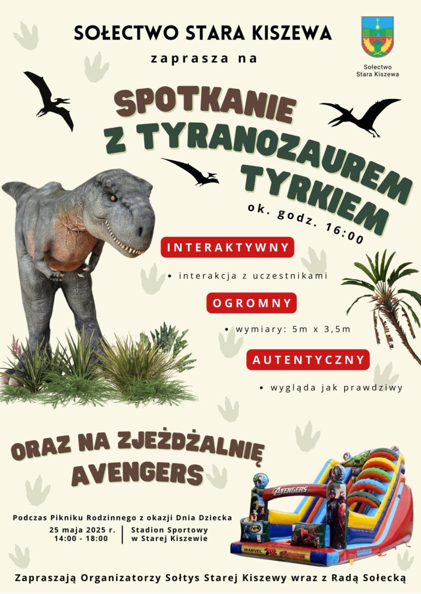Sołectwo Stara Kiszewa zaprasza wszystkie dzieci i ich rodziny na SPOTKANIE Z PRAWDZIWYM TYRANOZAUREM TYRKIEM – interaktywny, ogromny dinozaur, który wygląda jak żywy i nawiązuje kontakt z uczestnikami