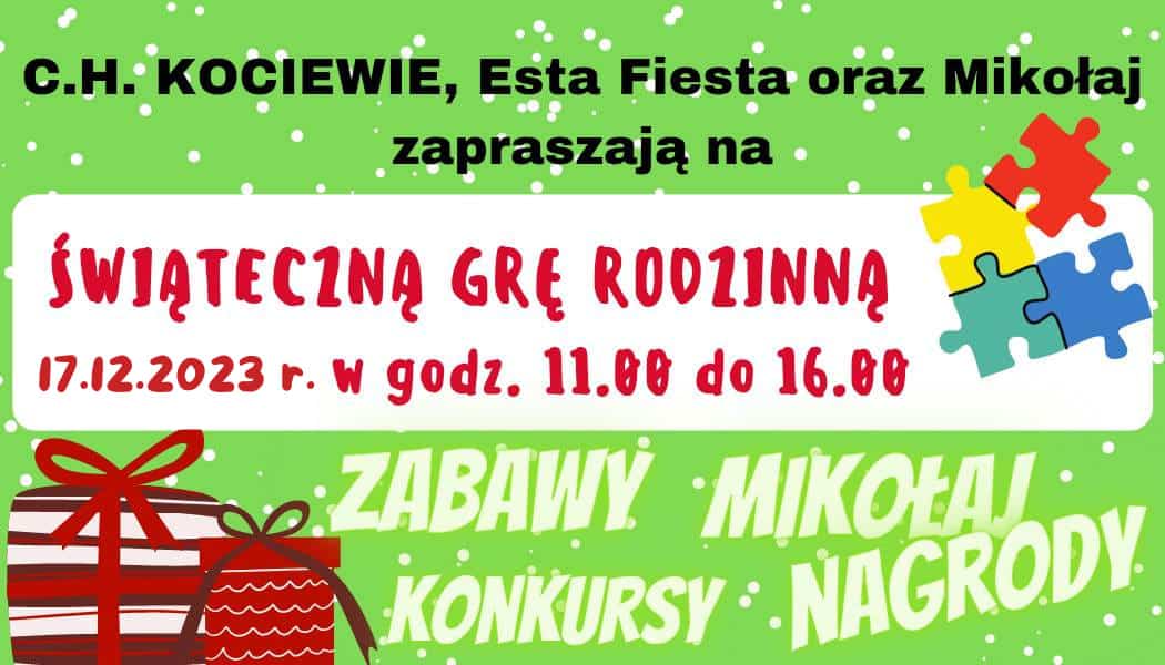 Zapraszamy wszystkich na niesamowite wydarzenie, które odbędzie się w naszym Centrum Handlowym Kociewie 17 grudnia w godzinach od 11.00 do 16.00 to wy wybieracie kiedy do nas przyjdziecie. Czekać na was będzie Świąteczna Gra Rodzinna, jest to już druga nasza edycja. Centrum opanują elfy wraz z Mikołajem, oprócz świetnych zdjęć będziecie mogli wygrać atrakcyjne nagrody.