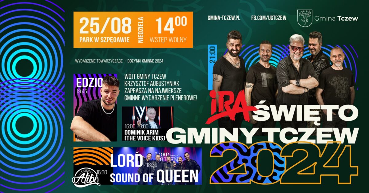⭐ 15:00 Kociewska Orkiestra Dęta “Torpeda” ⭐ 15:30 Zespół ludowy Rokocinianki ⭐ 16:00 Dominik Arim ⭐ 16:30 Zespół Alibi – polskie piosenki dawnych lat ⭐ 18:00 Dominik Arim ⭐ 18:30 LORD Sound of Queen ⭐ 19:45 EDZIO ⭐ 21:00GWIAZDA WIECZORU – Zespół IRA 🔥🔥🔥