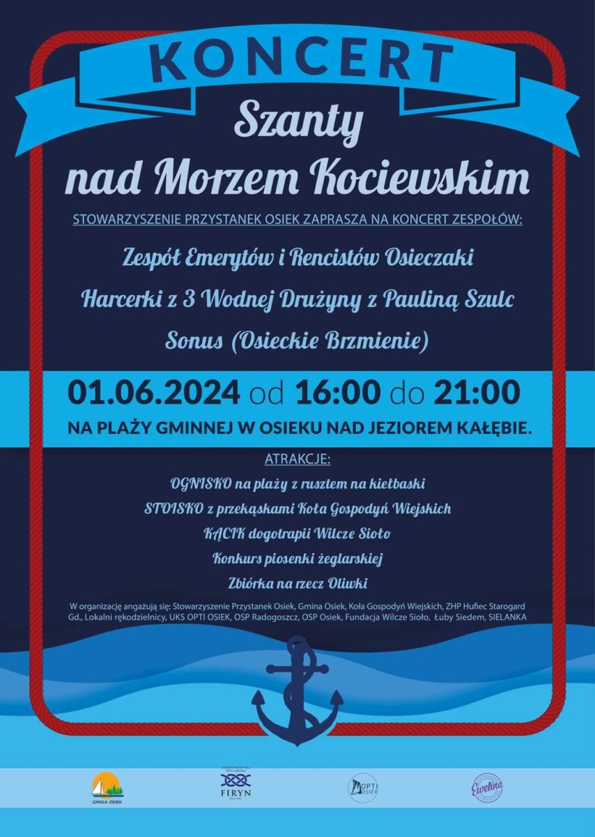 Zapraszamy na plażę gminną do Osieka nad jeziorem Kałębie w godz od godz.16.00 do 21.00 gdzie odbędą się koncerty lokalnych zespołów, harcerzy . Poza tym będzie możliwość spróbowania swoich sił na scenie w trakcie konkursu piosenki żeglarskiej. Poza występami bedą stoiska z ękodziełem, smaczne lokalne jedzonko , kiełbaski z grilla i ognisko. Podczas koncertu będą zbierane środki na rzecz rehabilitacji Oliwki Kozłowskiej która uległa poważnemu wypadkowi w zeszłym roku.
