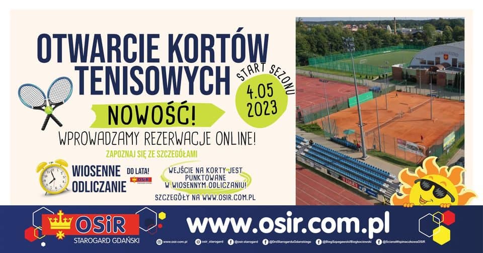 Zapraszamy serdecznie na Turniej Tenisa Ziemnego z okazji rozpoczęcia sezonu tenisowego OSIR. Wydarzenie odbędzie się w dniach 13-14 maja, od godziny 9:00. Będzie to wspaniała okazja do rywalizacji z innymi miłośnikami tenisa oraz do spędzenia czasu na świeżym powietrzu. Zapisy oraz więcej informacji już wkrótce.
