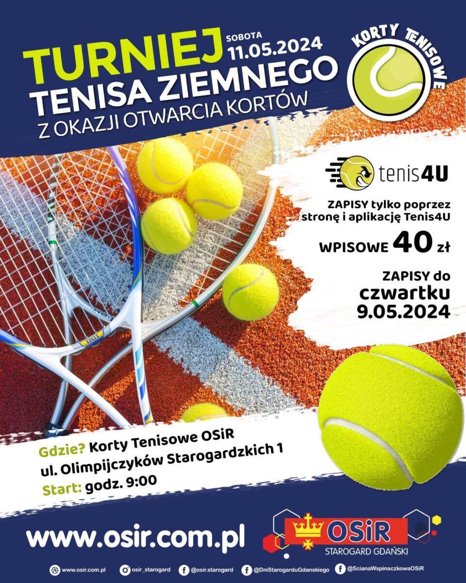 Serdecznie zapraszamy wszystkich mi艂o艣nik贸w tenisa na wyj膮tkowy turniej, kt贸ry odb臋dzie si臋 w dniach 11-12 maja 2024 roku na kortach tenisowych OSiR, Stadion Miejski im. K. Deyny.