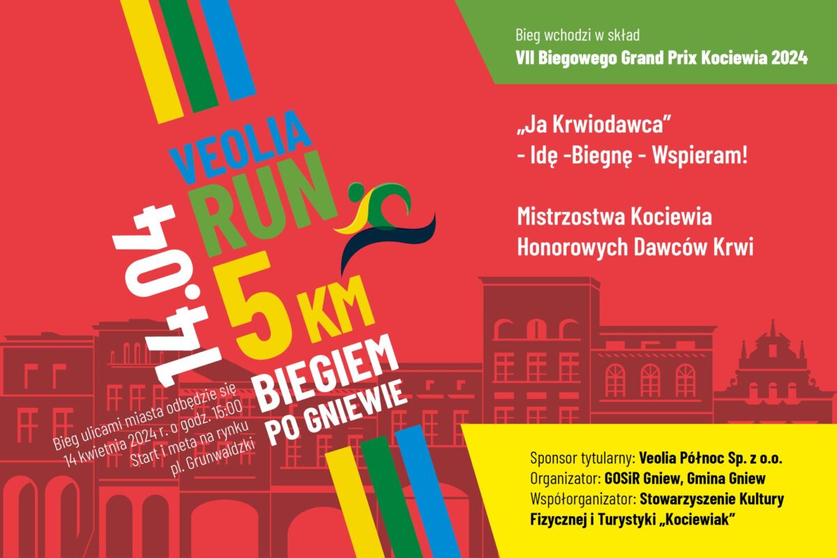 Mamy ogromną przyjemność ogłosić, że nadchodzi V edycja VEOLIA RUN – 5 km biegiem po Gniewie! 🏃‍♀️🏃‍♂️