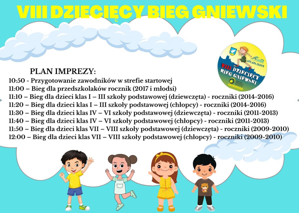 Zapraszamy dzieci i młodzież do udziału w VIII DZIECIĘCYM BIEGU GNIEWSKIM, który odbędzie się 2 września 2023 roku na Rynku Miejskim w Gniewie (Plac Grunwaldzki).