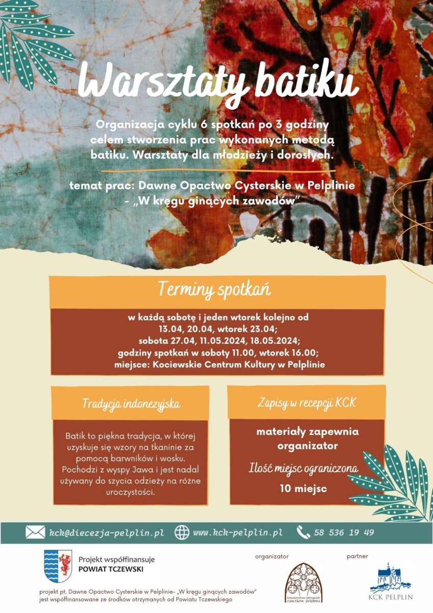 ❗️ Pierwsze warsztaty BATIKU odbędą się 13 kwietnia br., a następnie w każdą kolejną sobotę oraz jeden wtorek, 23 kwietnia. Ostatnie zajęcia planowane są na 18 maja. Udział w zajęciach jest darmowy, a mamy jeszcze wolne miejsca. Serdecznie zapraszamy do zapisów!