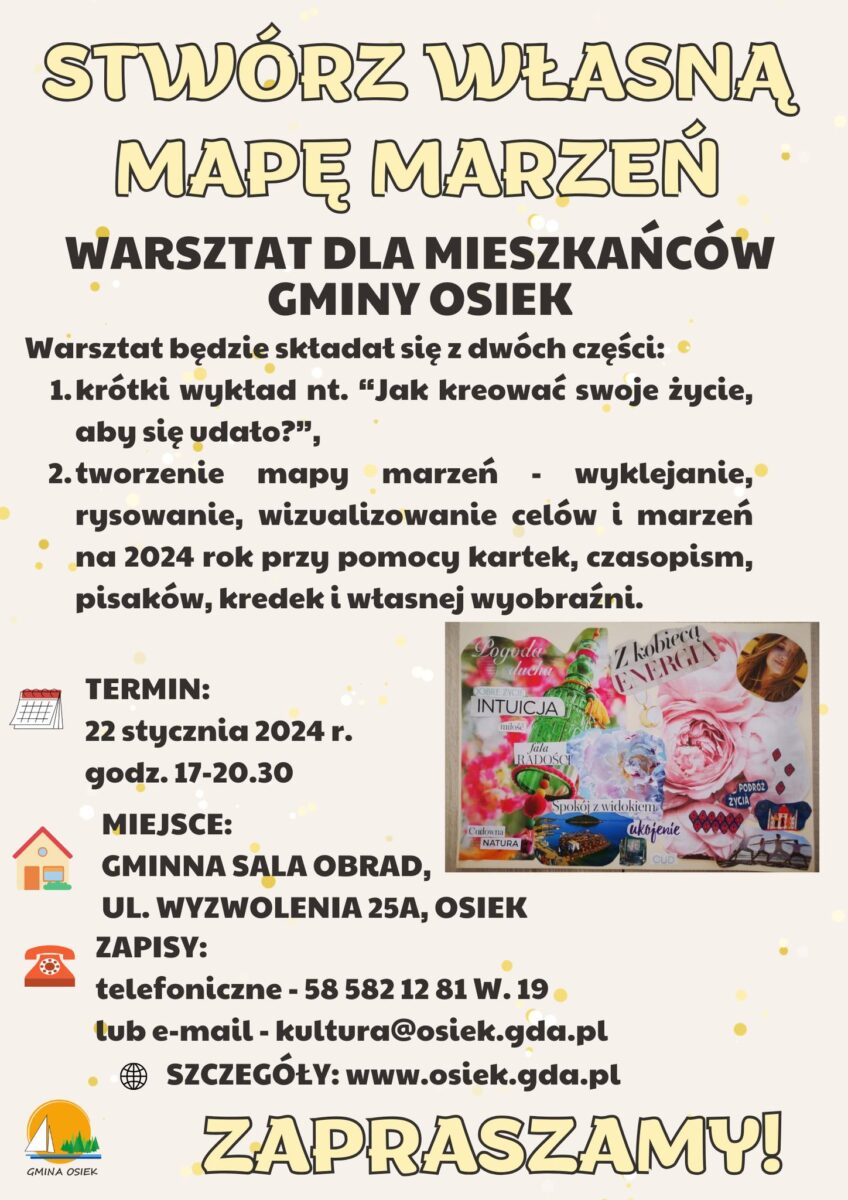 Dołącz do naszej twórczej społeczności, gdzie razem będziemy kleić, rysować, wizualizować nasze marzenia i cele na 2024 rok! 🎉🎨✨ #TworzenieMapyMarzeń #WarsztatyKreatywne #Osiek #GminaOsiek #RealizacjaCeli #Kreatywność #MarzeniaNaRok2024