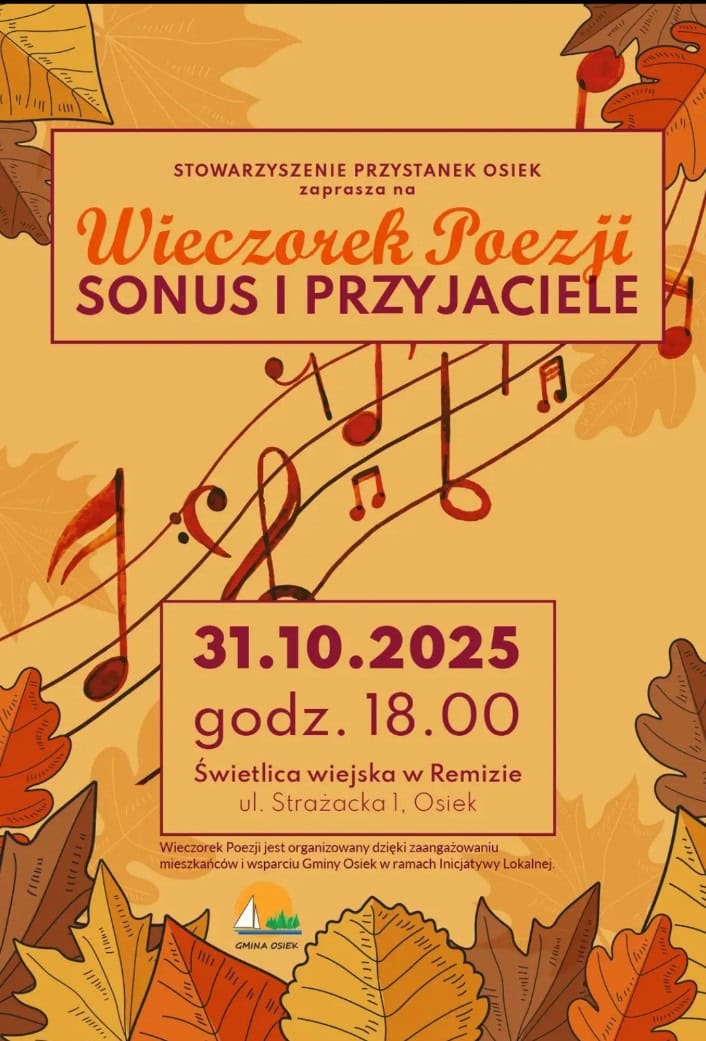 Stowarzyszenie Przystanek Osiek serdecznie zaprasza na wyjątkowy Wieczorek Poezji „Sonus i Przyjaciele” – spotkanie, podczas którego poezja i muzyka połączą się w kameralnej, jesiennej atmosferze.