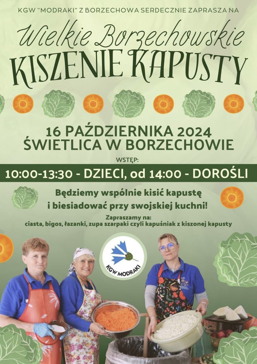 Serdecznie zapraszamy na Wielkie Borzechowskie Kiszenie Kapusty, organizowane przez KGW “Modraki” z Borzechowa!