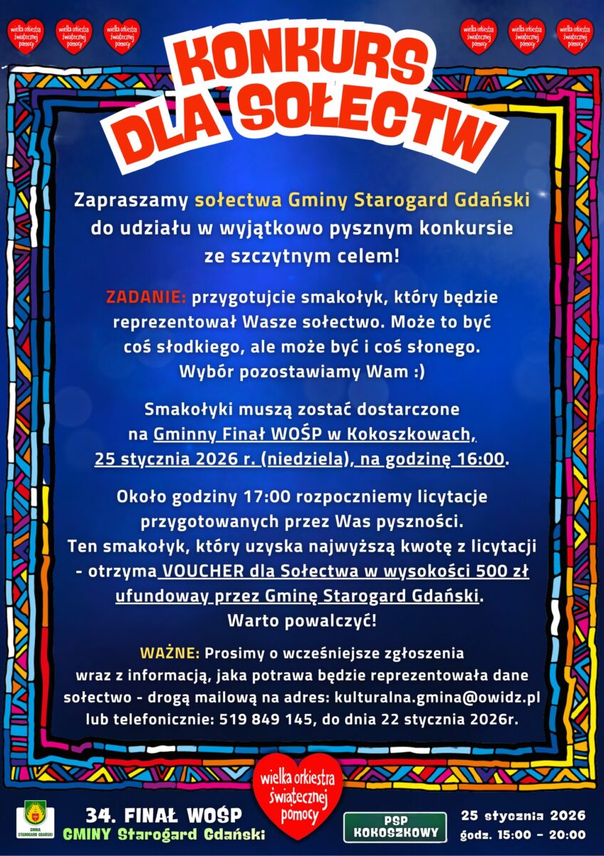 Przygotujcie smakołyk reprezentujący Wasze sołectwo – słodki lub słony – i dostarczcie go na finał WOŚP do Kokoszków 25 stycznia do godz. 16:00.