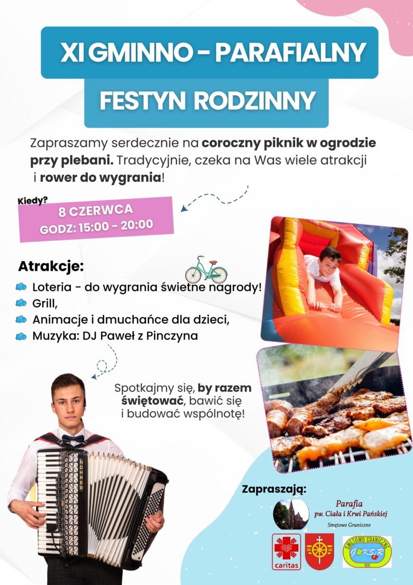Wspólnie z Parafią pw. Ciała i Krwi Pańskiej w Smętowie, Wójt Gminy Smętowo Graniczne – Anita Galant, GOKSiR oraz Parafialny Zespół Caritas zapraszamy Was serdecznie na coroczny piknik rodzinny pełen radości, atrakcji i wspólnej zabawy!