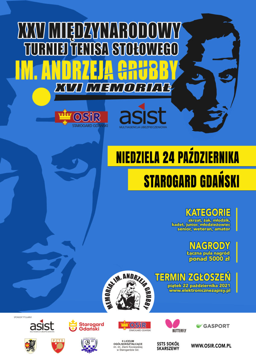 Zapraszamy wszystkich miłośników tenisa stołowego do udziału w XXV Międzynarodowym Turnieju Tenisa Stołowego im. Andrzeja Grubby z ASIST – XVI Memoriał, który odbędzie się w niedzielę 24 października w Starogardzie Gdańskim.