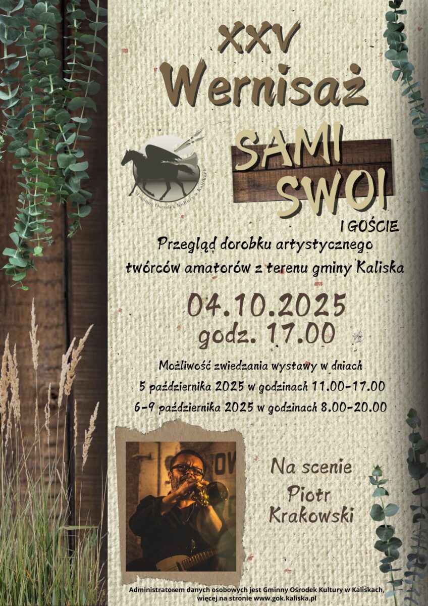 Serdecznie zapraszamy na jubileuszowy XXV Wernisaż „Sami Swoi i Goście” – wyjątkowe wydarzenie prezentujące dorobek artystyczny twórców-amatorów z terenu gminy Kaliska. 🌿