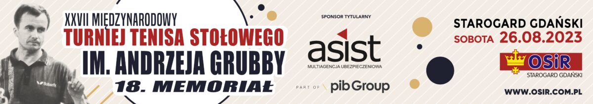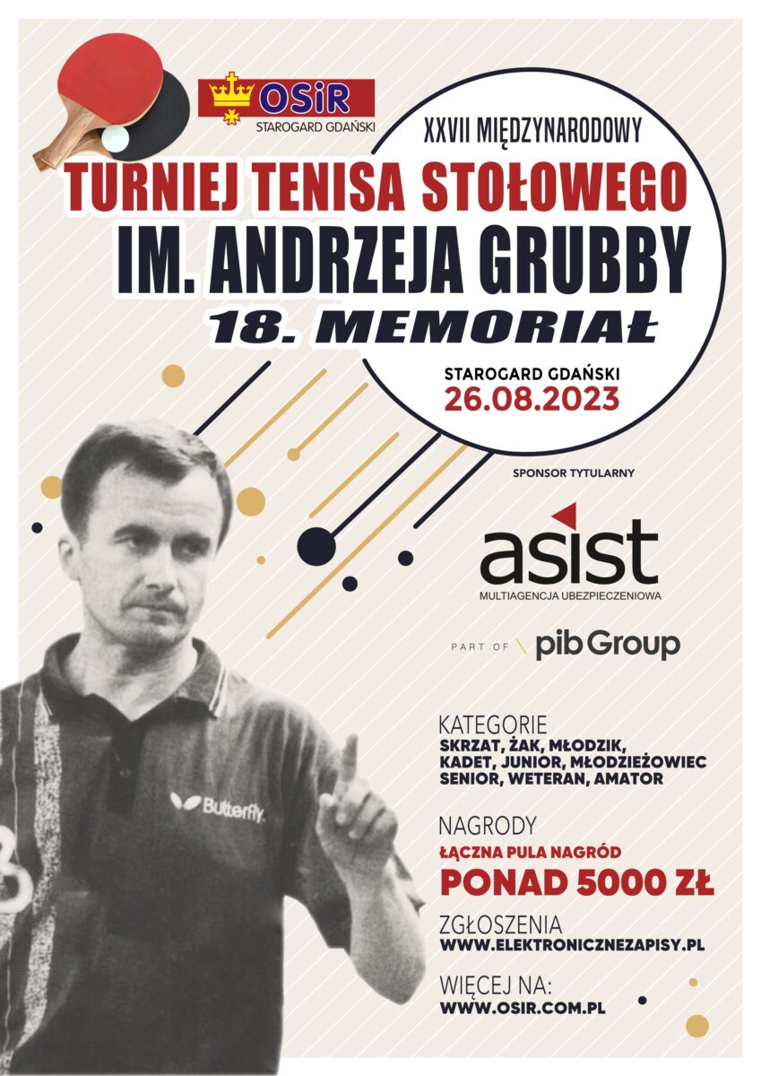 Zapraszamy wszystkich miłośników tenisa stołowego do udziału w XXVII Międzynarodowym Turnieju Tenisa Stołowego im. Andrzeja Grubby z Asist – 18. Memoriał, który odbędzie się w sobotę 26 sierpnia w Starogardzie Gdańskim.